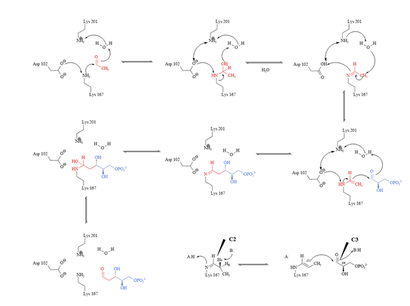 DERA醛缩酶活性中心Lys167上的ε-氨基和供体上的羰基结合,形成烯胺中间体,然后攻击受体羰基碳的Re面,形成新的C-C键,并产生R构型的立体中心。活性位点附近的水分子和两个氨基酸残基(Asp102,Lys201)组成了质子延迟系统,不仅为供体乙醛C2位上的亚胺和烯胺的质子重排提供质子,还为后续C3位上的羟基质子化提供质子,详见图2。